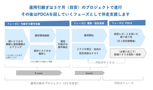 設定~実装作業をサービス範囲とし、まずは運用引継ぎプロジェクトとして、運用環境の確認から引継ぎ要件の整理、シナリオ修正・追加の設定実装を行います。その後はPDCAフェーズとして、振り返り会の実施と必要に応じて新規シナリオの設計~実装を担います。