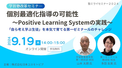 「自立学習」「生涯学習」を事業の軸とし、学習塾・学校・生涯学習教室向けICT教材システムの企画・制作・販売を手がける株式会社日本コスモトピア(本社:大阪府大阪市、代表取締役社長:尾上 幸裕、以下:日本コスモトピア)は、学習塾業界の課題にいち早く取り組んできた株式会社ウィザスからゲストを招き、学習塾を対象とした無料オンラインセミナー学習塾向け「塾ミライセミナー2024 第一ゼミナールに学ぶ個別最適化指導の可能性~Positive Learning Systemの実践~」を、2024年9月19日(木)14:00~15:00にてオンライン開催します。