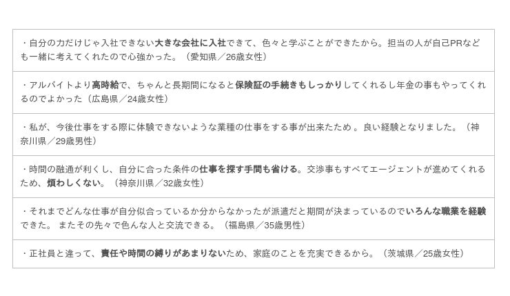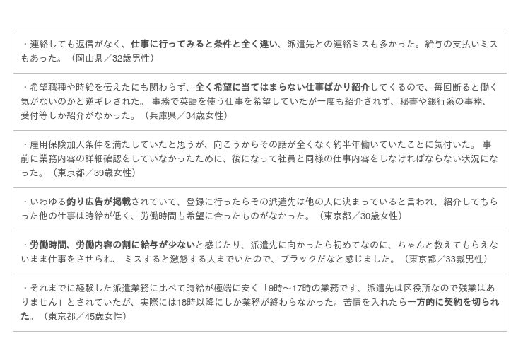 この結果からは、派遣会社を選ぶ際には募集されている求人の質だけでなく、派遣会社自体の質を見極めることが大切だということが分かりました。