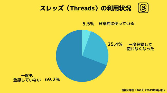 株式会社RECCOO(本社:東京都渋谷区、代表取締役:出谷 昌裕、以下、当社)が運営するZ世代に特化したクイックリサーチサービス『サークルアップ』は、現役Z世代201名を対象に実施した「スレッズ(Threads)の活用状況」の結果を発表します。7月6日のリリース後は大きな話題となったスレッズ(Threads)ですが、最新の活用状況をリリースから2ヶ月経った2023年9月6日時点で確認したところ、日常的に活用している大学生は5.5%であることがわかりました。一方、こちらも名称変更で話題になったX(Twitter)の利用率は63.2%でした。