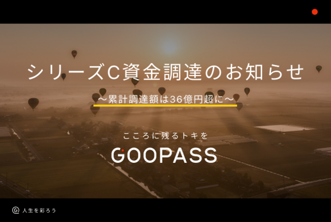 GOOPASS株式会社(本社:東京都渋谷区、代表取締役:高坂勲、以下:GOOPASS)は、株式会社ビックカメラ、株式会社NTTドコモ・ベンチャーズ、三井住友トラスト・パナソニックファイナンス株式会社、いわぎん事業創造キャピタル株式会社、株式会社佐銀キャピタル&コンサルティングなどを主な引受先としてシリーズCラウンドの資金調達における1stクローズを完了しましたことをお知らせ致します。これにより、第三者割当増資および、融資、機材調達枠としての累計調達額は36億円超になります。 この度の資金調達により、『GOOPASS』ブランドのサービス拡大、機材の拡充、また新規事業開発、地域創生、人材育成を加速、強化します。引き続き、最終クローズに向けた資金調達を継続してまいります。