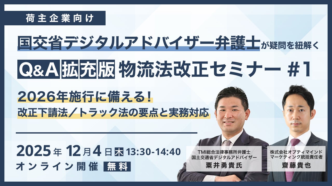 株式会社オプティマインド(本社:名古屋市、代表取締役:松下 健)は、2025年12月4日(木)13時30分より、「国土交通省デジタルアドバイザー弁護士が疑問を紐解く物流法改正対応セミナー」の第1回をオンラインにて開催いたします。