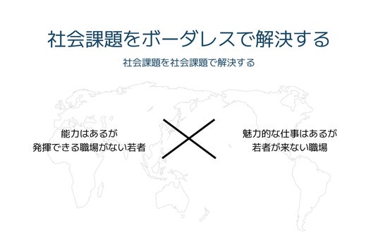 例えば、「能力はあるが発揮できる場所がない」という社会課題を抱える人と「仕事はあるのに人材が集まらない」という社会課題を抱える企業をつなぐことで、双方の課題を解決することができます。このように、社会課題同士を掛け合わせ、互いの課題を解決することを目指し、現在はチョクトリサービスを通じて、若者が能力を発揮できる職場を創出することに注力しています。