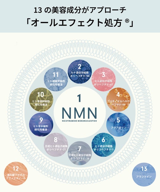 NMNの魅力を存分に引き出すために、3種のヒト幹細胞培養液(※5 )、7種のペプチド(※5 )、2種のサポート成分を配合。最新の研究に基づいたNMNを含む、13成分の絶妙配合こそが、NMN 13シリーズ独自の「オールエフェクト処方(R)」です。輝くツヤ肌にアプローチし、若々しい印象の肌へのステップをサポートします。