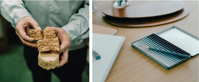 創業70年以上の老舗鉛筆メーカー『北星鉛筆』の職人によってつくられたCRAFTS MAN PENCIL 12set(写真:右下)は、Standard Productsの中でも特に人気のアイテムです。その鉛筆の製造工程で出る端材を再利用し、「着火薪」(写真:左下)として販売しています。鉛筆の木材にはロウが含まれているため火がつきやすく、煙が少ない状態で、木材単体に比べて長時間の燃焼が可能です。焚き火などのアウトドア、暖炉の着火などにおすすめです。