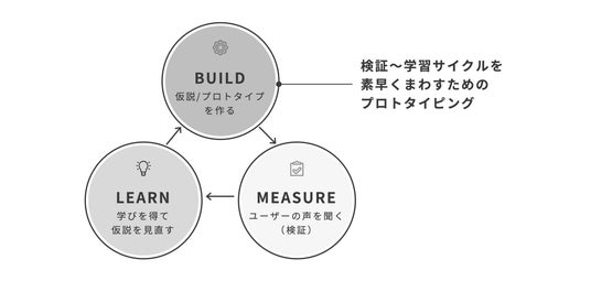 「BUILD(仮説/プロトタイプを作る)→ MEASURE(ユーザーの声を聞く・検証)→ LEARN(学びを得て仮説を見直す)」のサイクルを可能な限り素早くまわすことで、効果的な仮説検証を実現します。