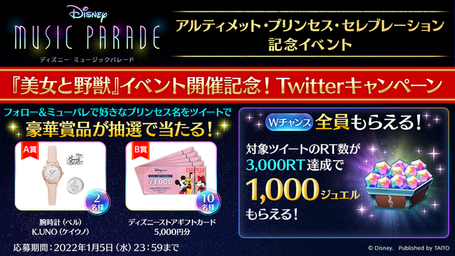 『ディズニー ミュージックパレード』公式Twitterアカウント(@musicparade_jp)をフォローして、指定ハッシュタグ「#ミューパレ美女と野獣キャンペーン」とミューパレで好きなプリンセスの名前をツイートしていただいた方の中から、抽選で以下の賞品をプレゼントいたします。また、Wチャンスで対象ツイートをリツイートして、3,000リツイートを達成するとユーザー全員に1,000ジュエルをプレゼントいたします。