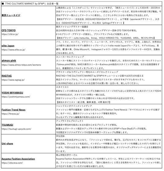 「THE CULTIVATE MARKET by SFW(R)」は、渋谷ファッションウィークがこれまでの13年の歴史で積み重ねてきたネットワークを活かし、渋谷ファッションウィークのランウェイショーに参加したファッションデザイナーやインフルエンサー、スタイリスト、ブランド、学生サークル、日本で唯一のファッションデザイナー団体CFD TOKYOやアップサイクルプロジェクト「TSUMUGI」など、多様な分野で活躍する顔ぶれが出店します。会場では、出店団体の想いが詰まった私物やTシャツ、アクセサリーなどのファッションアイテム、グッズなど、ここでしか出合えない商品が並び、単なる物の売買にとどまらず、会話が生まれ価値観が交差しヒトモノコトが出合い、訪れる人も自然と仲間になっていくような関係を育てる場を目指します。