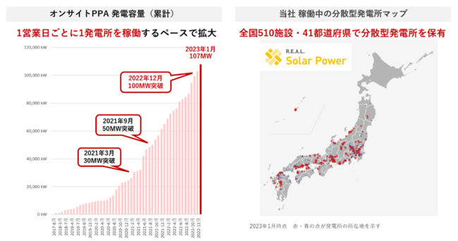 アイ・グリッドでは流通小売や物流施設などの屋根上を活用し、自然環境に影響を及ぼすことなく、再生可能エネルギーを創出するオンサイトPPA事業を推進しています。子会社であるVPPJを通じてオンサイトPPAモデル国内No.1(※1)となる分散型太陽光発電所を急速に拡充し、2023年1月時点で41都道府県 510施設 107MWの稼働施設を保有しています。