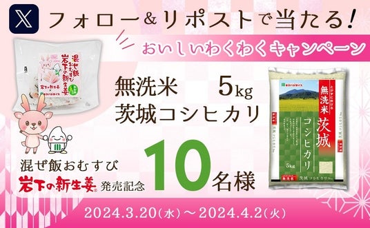 「混ぜ飯おむすび 岩下の新生姜(R)」の発売を記念して、ミツハシライスのコシヒカリ5kgが当たるキャンペーンを実施致します。