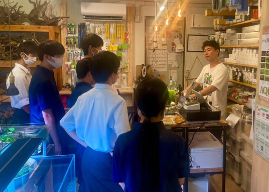 アクアリウムショップで丁寧な指導を受ける