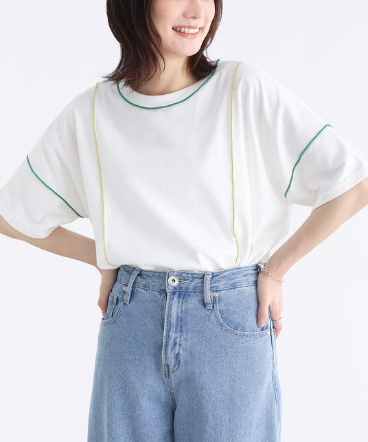 表面は綿タッチ・裏面はポリステルを使うことで、触れた瞬間ひんやり冷たく感じる二重天竺カットソー生地です。二色の配色メローのあしらいがアクセントになります。