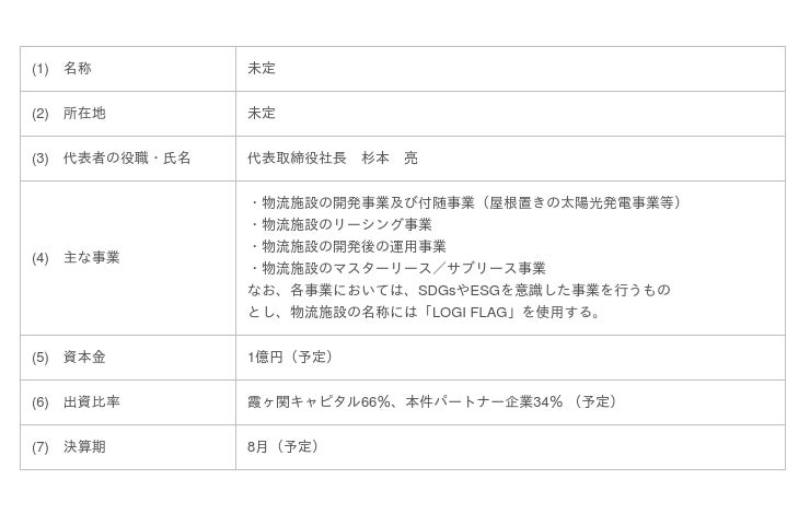 霞ヶ関キャピタル株式会社(本社:東京都千代田区、代表取締役社長:河本 幸士郎/以下「当社」)は、国内大手事業会社(以下「本件パートナー企業」)と、2021年9月30日(木)、物流施設開発事業を行う合弁会社(以下「本合弁会社」)の設立に向け、基本合意書(以下「本合意書」)を締結し、事業化に向けた検討を進めることとなりましたので、 下記のとおりお知らせいたします。