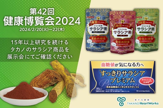 タカノ株式会社(本社:長野県上伊那郡宮田村、代表取締役社長:鷹野 準)は、2024年2月20日(火)~22日(木)に東京ビッグサイトで開催される「第42回 健康博覧会2024」に出展いたします。サラシアエキス粉末(原料)および、これら原料を使用したお茶・錠剤・顆粒・ゼリータイプの展示をいたします。ぜひ、タカノブースへお立ち寄りください。