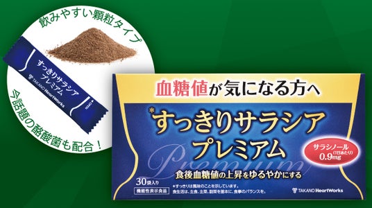水に溶けやすい「顆粒」タイプ。サラシア由来サラシノールをタカノのサラシアシリーズ内で最も多い0.3mg/袋 配合。酪酸菌も配合しています。