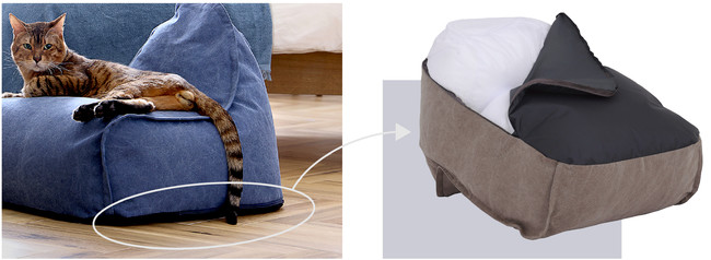 ブッバで一緒にくつろぐには狭い。ではペット用にリサイズしてネコちゃんたちとお揃いで使ってくれたら絶対に可愛いはず!とペット仕様のクッションとして新たに開発しました。