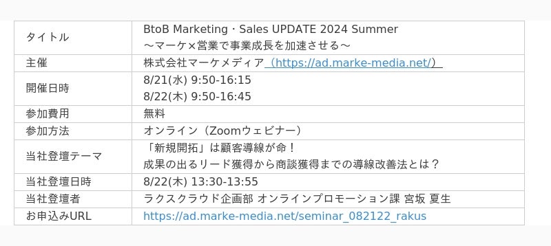 延べ10,000社以上の新規顧客開拓や商談創出を支援してきた「配配メール」を提供する株式会社ラクス(本社:東京都渋谷区、代表取締役:中村崇則)は、8/21(水) ~8/22(木) に開催される株式会社マーケメディア(本社:東京都品川区、代表取締役:三浦和広)主催のカンファレンス「BtoB Marketing・Sales UPDATE 2024 Summer」に登壇いたします。