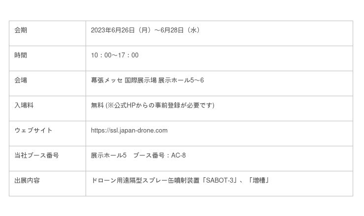 当社の連結子会社である東洋製罐株式会社は、ドローン用の遠隔型スプレー缶噴射装置である「SABOT-3」を、日本最大の民間ドローン専門展示会&コンファレンスの単独イベントである「Japan Drone 2023」(2023年6月26日(月)~6月28日(水) 幕張メッセ)に出展いたします。