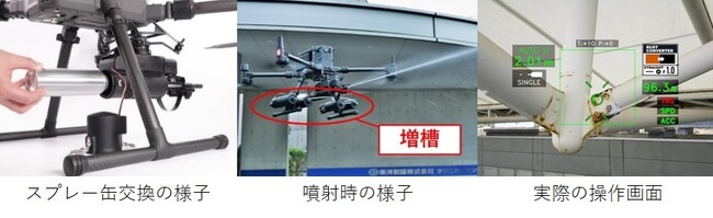 今回の展示会では、最新の産業用ドローンに対応した「SABOT-3」および、スプレー缶を追加搭載することで噴射容量を増大させる補助噴射装置「増槽」の実物展示を行います。このほか、デモとして水の噴射体験や、実際に作業現場で使用されている内容物(マーキングや防錆剤、補修剤)の噴射見本などを展示予定です。