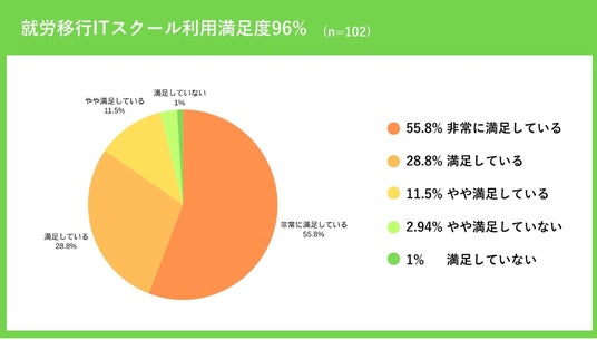就労移行ITスクールの利用者を対象(回答数:102)に利用満足度を5段階で聞いたところ、「非常に満足している」が55.8%、「満足している」が28.8%、「やや満足している」が11.5%と、合計して利用満足度96%の大変高い評価をいただく結果となりました。