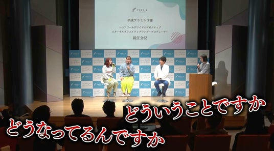 2024年3月に行われた就任記者発表会では、打ち合わせと称して会見場に連れてこられた平成フラミンゴが、いきなり就任記者発表会に参加させられるというドッキリを企画。記者発表会で流れた事前インタビューでは、悪意のある編集により質問内容が差し替えられたインタビュー映像に会場は大混乱!状況が読めない中進行していく記者発表会に、慌てふためくお二人に注目です。