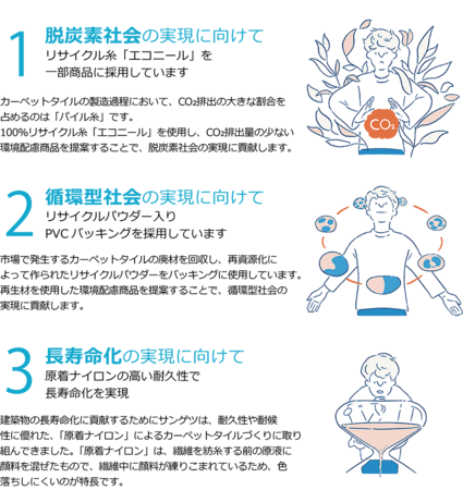 当社「DT」シリーズで初めて、収録商品の全点にリサイクル素材を採用しました。表面のパイルには、耐久性・耐候性に優れた原着ナイロンや、漁網やカーペット廃材などを使用した100%リサイクル⽷「エコニール(R)」を採用。また、裏面のバッキング材の一部には、廃棄されたカーペットタイルから作られたリサイクルパウダーを使用しました。“未来に届くものだから 今を大事につくりたい”という開発コンセプトをベースに、環境配慮商品となった「DT」シリーズを通じて、「脱炭素社会」「循環型社会」「長寿命化」の実現に貢献します。