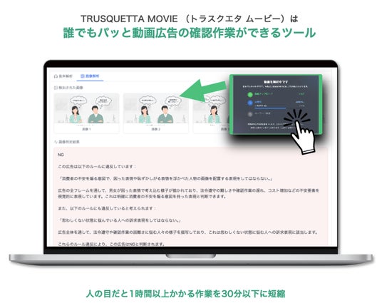 『AIで確認作業をスマートに。』を掲げて活動している株式会社トラスクエタ(所在地:東京都渋谷区、代表取締役:高橋聡)は、確認作業スマート化ツール 『TRUSQUETTA(トラスクエタ)』で動画広告表現の確認作業ができる機能を実装したので、ここにお知らせいたします。