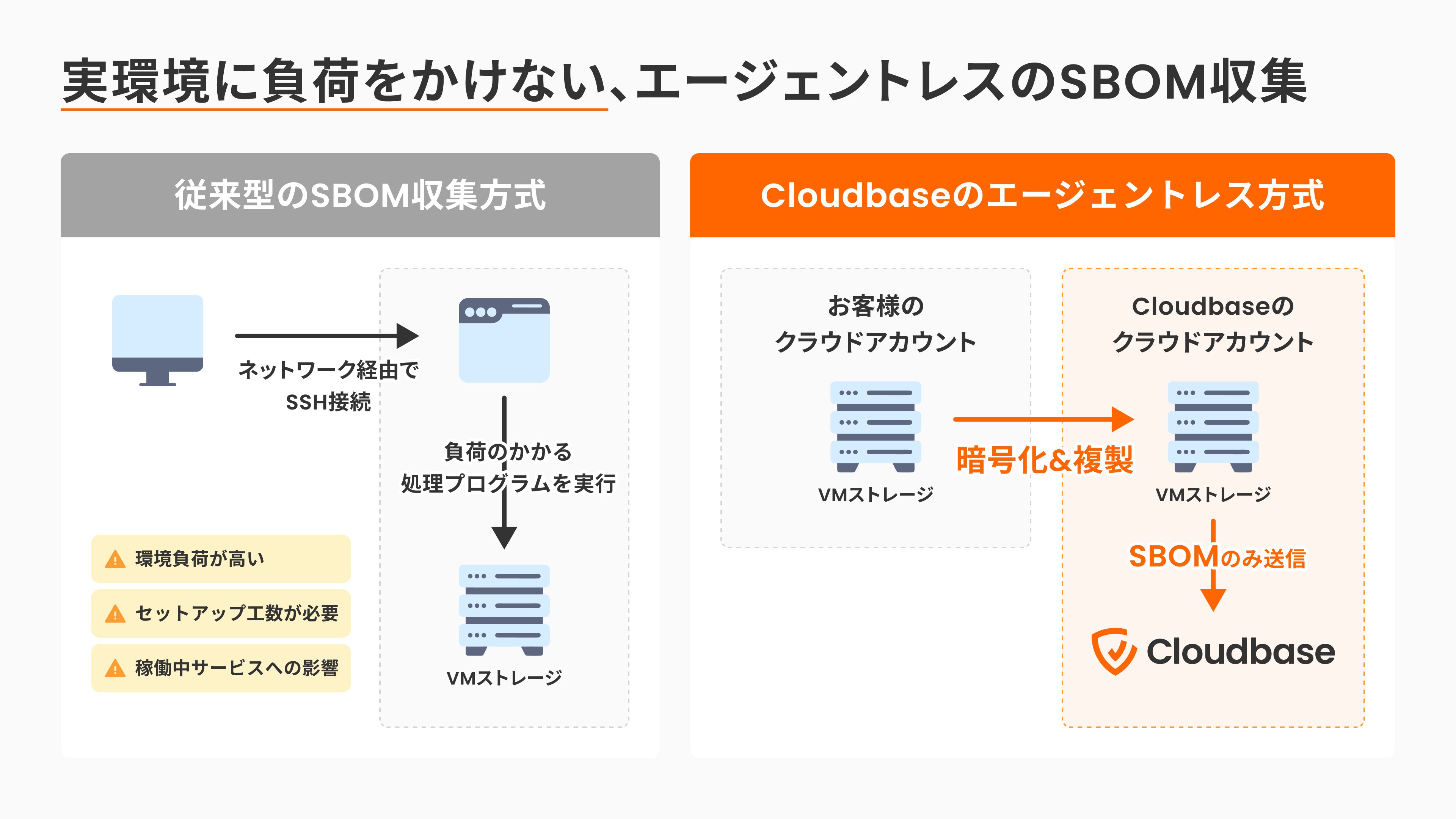 VMを対象としたSBOMスキャンでは、稼働中のVMに直接アクセスすることはありません。VMのスナップショットを暗号化して複製し、解析処理はCloudbase側の安全な環境で実施します。