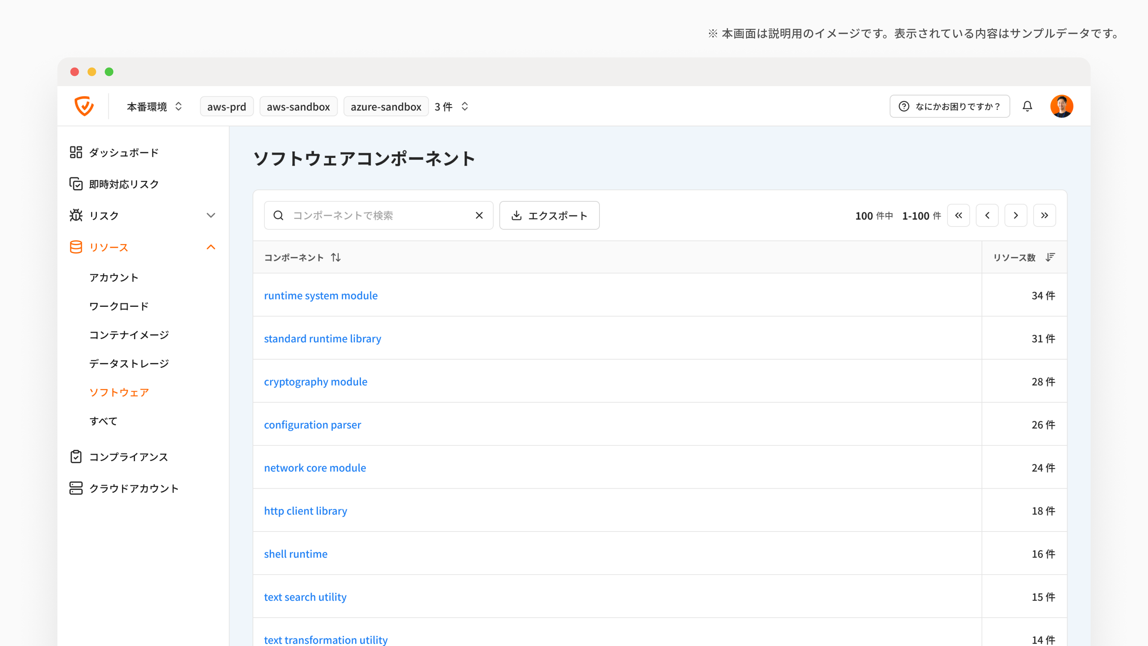 本画面では、指定したプロジェクトやクラウドアカウントに含まれるソフトウェアコンポーネントと、それを含むリソース数を確認できます。