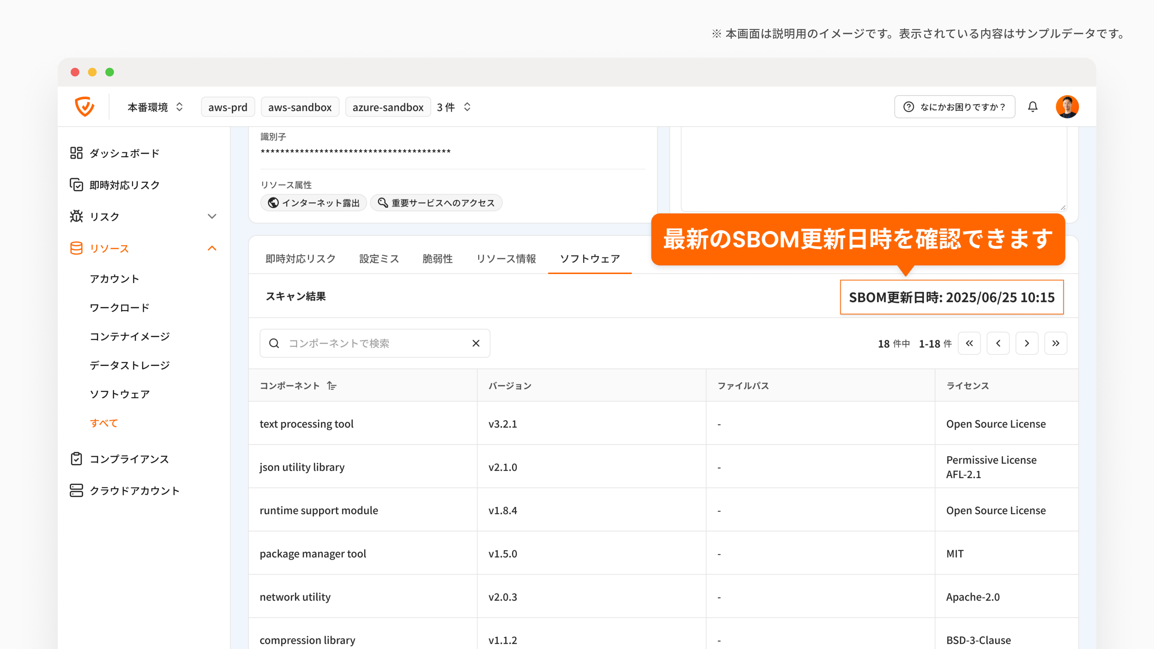 SBOM が生成されるリソースの詳細画面に、新たに「ソフトウェア」タブを追加しました。これによりリソース単位で含まれるソフトウェアコンポーネントを一覧で確認できます。