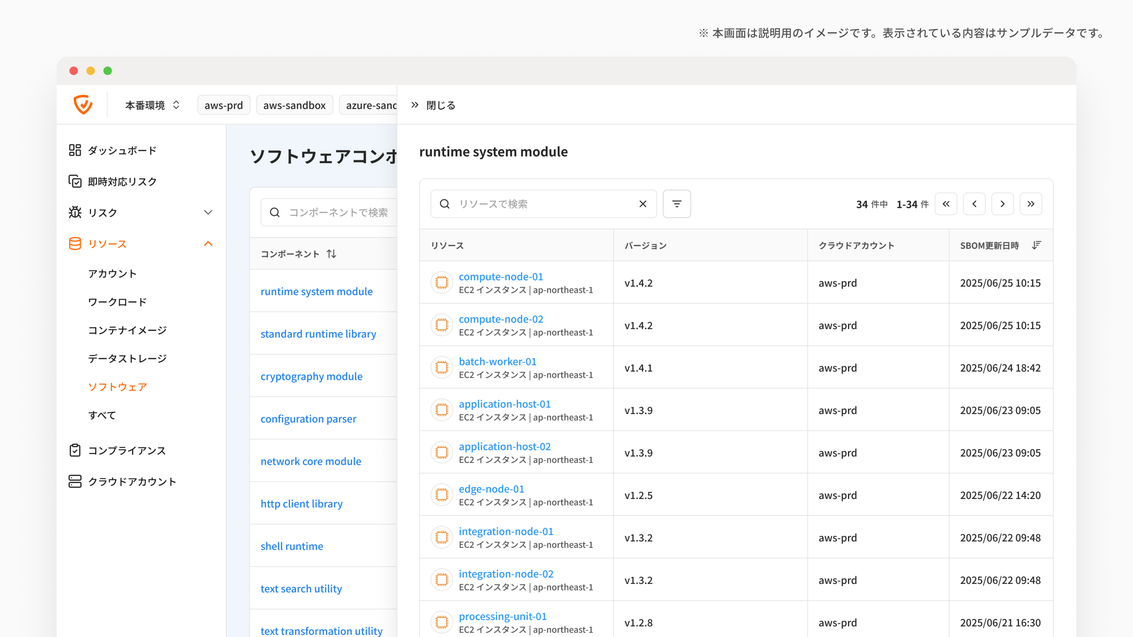 バージョン指定による絞り込みや、リソース名検索、SBOM更新日時でのソートも可能です。