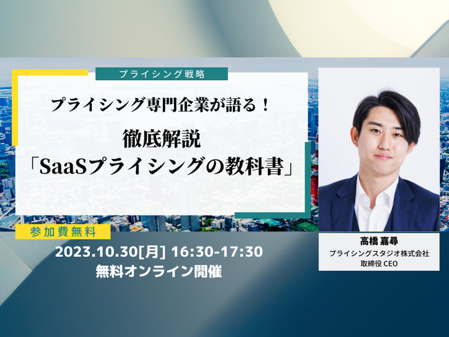 プライシングスタジオ株式会社(本社:東京都港区、代表取締役:高橋 嘉尋)は、無料オンラインセミナー『徹底解説「SaaSプライシングの教科書」』を、10月30日(月)16時30分に開催いたします。