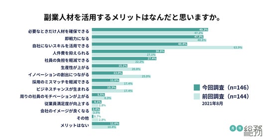 副業人材を活用するメリットはなんだと思うか尋ねたところ、「必要なときだけ人材を確保できる」が49.3%で最も多く、「即戦力になる」が47.3%と続きました。前回調査では「自社にないスキルを活用できる」が63.9%で最多でしたが、今回は40.4%で、23.5ポイント減少する結果となりました(n=146)。