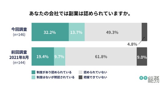 会社で副業が認められているか尋ねたところ、「制度があり認められている」32.2%で、2021年8月の調査より12.8ポイント増加しました(n=146)。