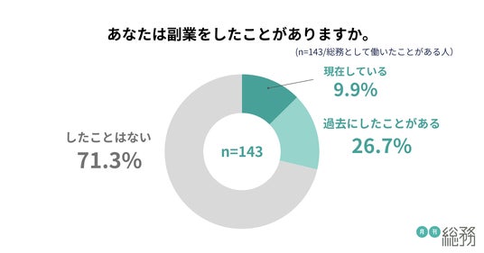 本アンケートに回答した総務の方自身が副業をしたことがあるか尋ねたところ、約3割が副業経験があることがわかりました(n=143/総務として働いたことがある人)。