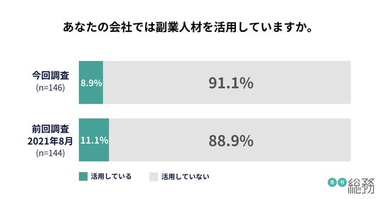 副業人材を活用しているか尋ねたところ、「活用している」が8.9%、「活用していない」が91.1%という結果になりました(n=146)。
