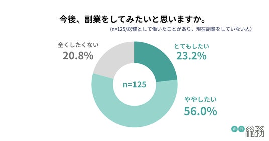 現在副業をしていない総務に対し、今後、副業をしてみたいと思うか尋ねたところ、約8割が副業をしてみたいと回答しました(n=125/総務として働いたことがあり、現在副業をしていない人)。