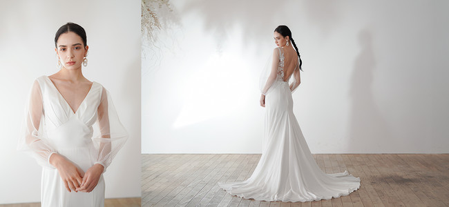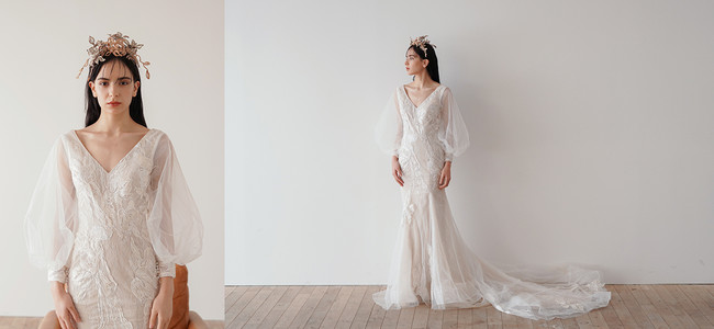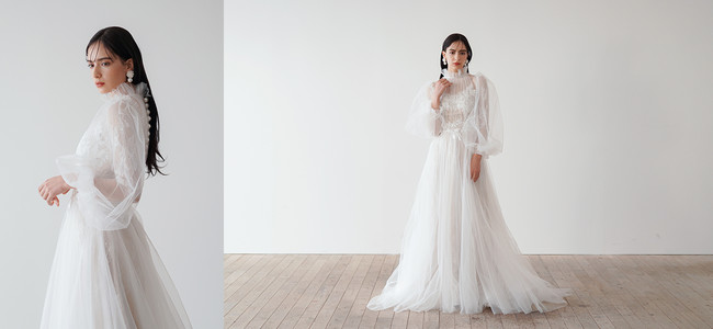 自然と調和することを大切にしており、海や緑、花畑などを舞台にしたロケーション撮影との相性がよいのが特徴。透け感のあるやわらかな素材が、風さえも味方にしてくれる。花嫁さまの、人生で最も美しい日を彩ります。