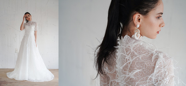 又、レースの美しさや素材の質感も撮影時にお楽しみいただけるよう、インポートものの上質な素材のレースを用い、くるみボタンやパールのモチーフとの組み合わせ、配置にも工夫を施すなど、ディテールもこだわり抜いたラインアップとなっております。