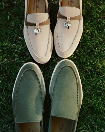 2006年、クラシックなデッキシューズに代わる自然でエレガントなシューズとしてポルトフィーノで誕生したサマー・ウォークは、世界中を旅しながら進化を遂げてきました。撥水加工を施した上質なスエードを使用し、ソフトでありながらフォルムが崩れない絶妙な厚みに仕上げられています。このモカシンにはロロ・ピアーナのアイコニックなホワイトソールを使用しており、天然ゴムとテクニカル素材の独自のブレンドで安定性、柔軟性と個性を表現しています。アッパーの下部には、靴づくりの伝統に則った蝋引き糸を用いて職人の手仕事によりステッチが施されています。レディスのモデルのチャームは職人技とスポーツにふさわしい性能を見事に融合させたメゾンを象徴するディテールであり、快適な履き心地とスタイルを象徴しています。