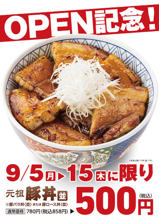 富士吉原店のオープンを記念して、9/5(月)~15(木)の期間中、当店自慢の「豚バラ丼〈並〉」または「豚ロース丼〈並〉」を特別価格500円(税込)にて提供いたします。