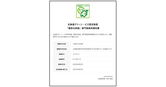 「工房Smith札幌」|北海道グリーン・ビズ認定制度「優良な取組」部門登録済通知書