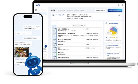 AIイベントプランナー「Canjii(カンジー)」「Canjii」は、AIイベントプランナーが社内イベントの会場探し・企画・準備の効率化をサポートする幹事向けサービスです。多くのイベント幹事様を悩ませる、予算や参加人数に合致する会場探し・イベントコンテンツの発案・進行管理表の作成を「Canjii」がサポート。通常業務と並行するには手一杯な幹事様も「Canjii」と一緒に準備をすれば、チームの勢いを加速させるすてきなイベントが開催できます。