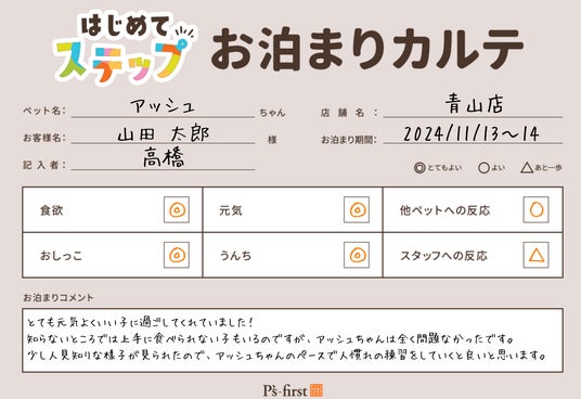 また、はじめてステイ中は、「ペッツファースト社会化トレーナー資格」を持つ店舗スタッフが、社会化の進度チェックをし、その結果をカルテとして飼い主様にフィードバックいたします。