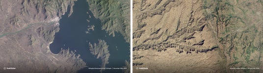 当社運用の小型地球観測衛星「GRUS-1」により撮影したエチオピアの水力発電ダム(左)と大地溝帯(右)の衛星画像