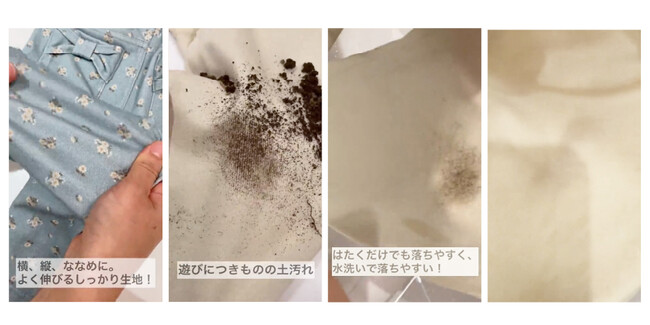 〈縦横斜めにしっかり伸びる【高いストレッチ性】〉〈水溶性の汚れが落ちやすい【防汚機能】〉