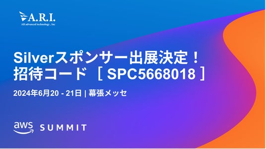 ARアドバンストテクノロジ株式会社(本社:東京都渋谷区、代表取締役社長:武内 寿憲、以下ARI)は、2024年6月20日(木)、21日(金)幕張メッセにて開催されるアマゾン ウェブ サービス(以下 AWS)を学ぶイベント「AWS Summit Japan」にSilverスポンサーとして出展することをお知らせいたします。