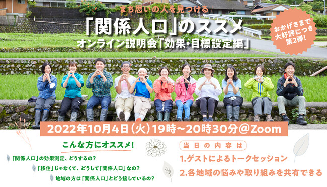 今回は、今年5月に開催した説明会の第2弾で、テーマを「効果・目標設定編」としました。多くの自治体が、関係人口創出事業に取り組む必要性を感じつつ「事業を実施中だが、効果的な取り組みが実施できていないと感じる」「事業を始めるにあたって、得られる成果が明確でなく上長・組織の理解を得にくい」などの課題を抱えていることが、前回のアンケートからも分かっています。こういった悩みを少しでも解決するためのヒントとなるようなご説明をする予定です。