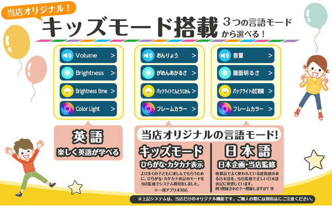 また、キッズモードと日本語に関しては、日本企画・当店監修でシステム開発を行った、正真正銘の当店限定オリジナルのシステムとなっています。ご購入の際は類似品にご注意ください。