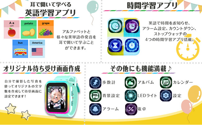 写真・動画・音楽・ライト・ゲーム・英語学習など全20アプリを搭載した、キッズスマートウォッチ。